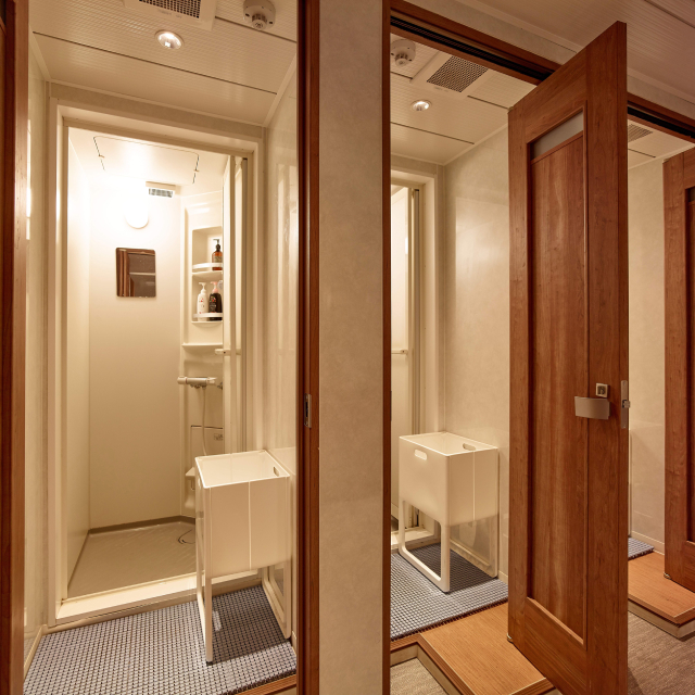 24시간 언제든지 이용 가능한 남성 전용 개인 샤워실에는 린스 인 샴푸, 바디워시가 비치되어 있습니다.